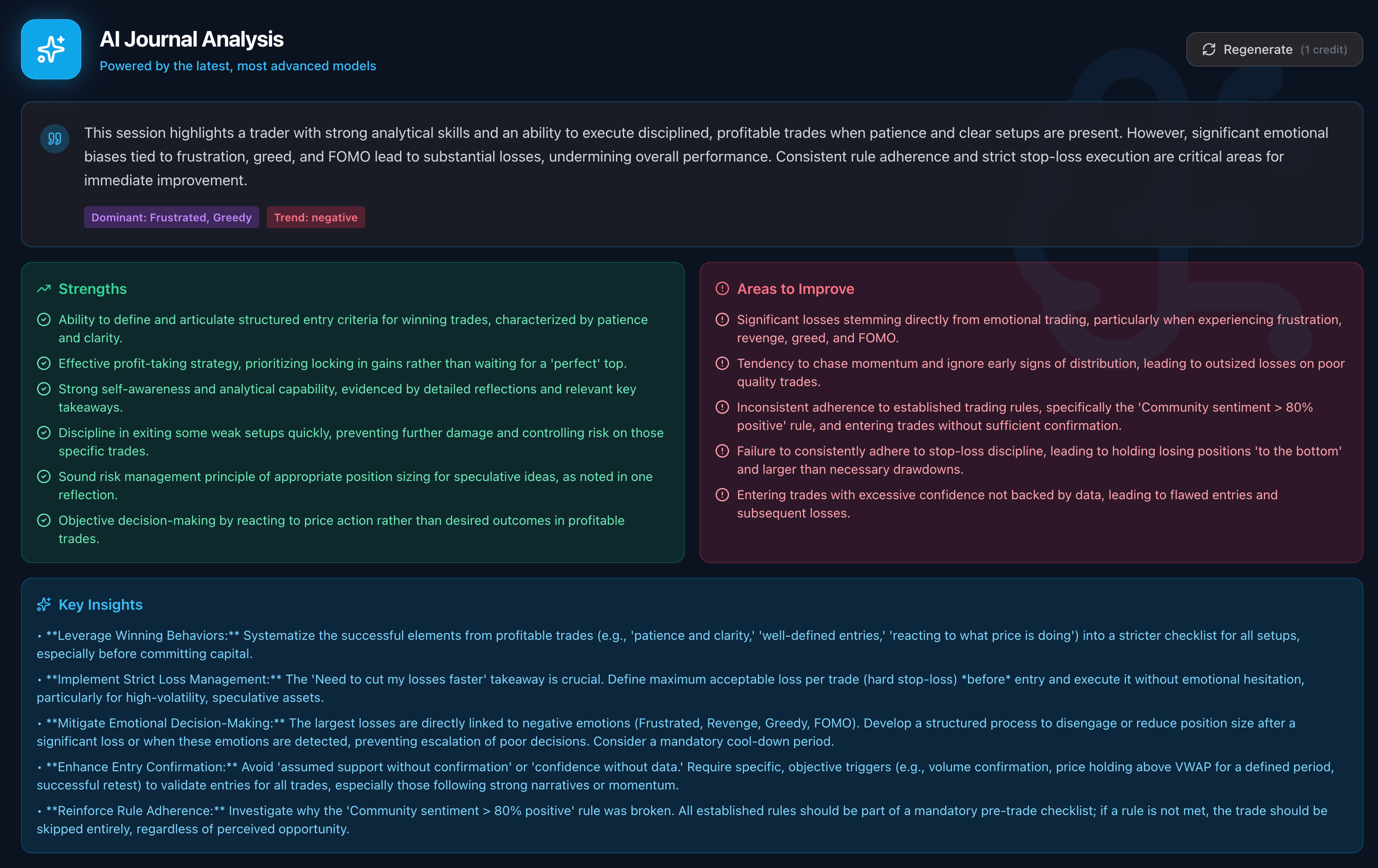Get personalized insights on your trading patterns. Our AI analyzes your journal entries and trade data to help you identify strengths, weaknesses, and areas for improvement.